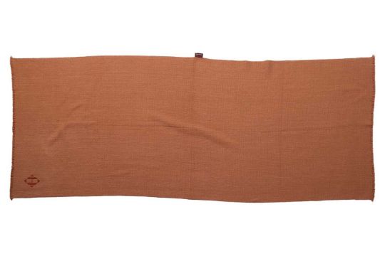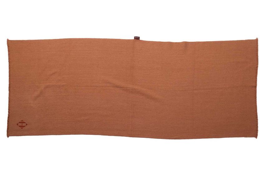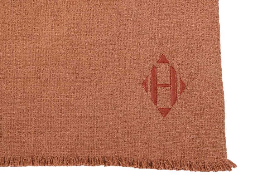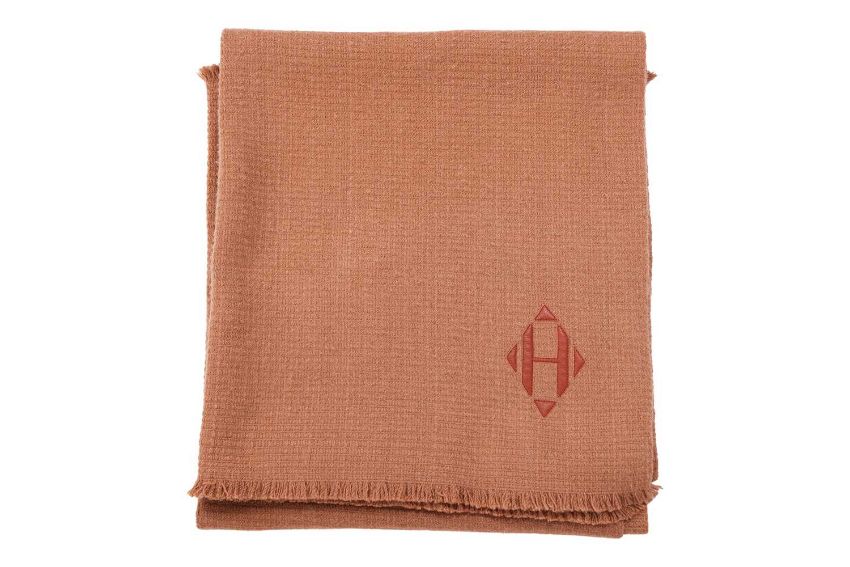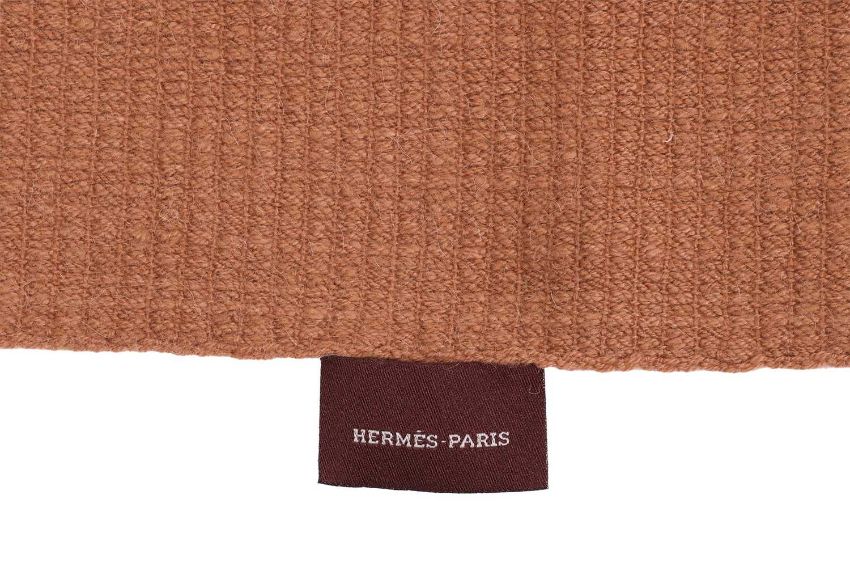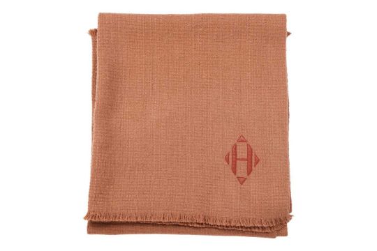 Hermès - a muffler in camel wool and cashmere, with fringe edges and an embossed leather 'H' at the corner. F/W 2017. W75 x L205 cm.
