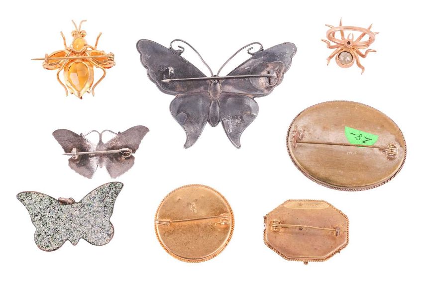 Comprising of two enamelled butterfly brooches by John Atkins & Sons, three micro mosaic brooches, a gem set spider ring, an insect brooch and an additonal enamelled butterly pendant, gross weight 76.64grs (8)
