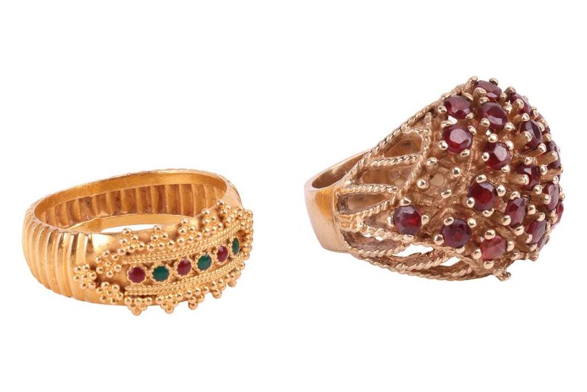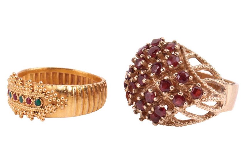 A 9ct gold garnet cluster ring and a yellow metal gem set ring; The 9ct gold garnet cluster ring of bombe design with woven borders, claw set with 21 round cut garnets, two stones deficient, ring head approximately 1.8 x 2.3cm, UK hallmarks, size L; The yellow metal gem set ring centred with a line of six alternating round green and red paste, in Etruscan Revival style with granulation detail, ring head approximately 0.9 x 1.9cm, yellow metal testing as 22ct, size O; Total weight 12.0g. (2)