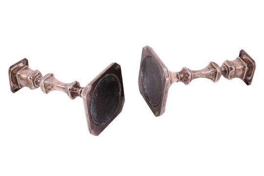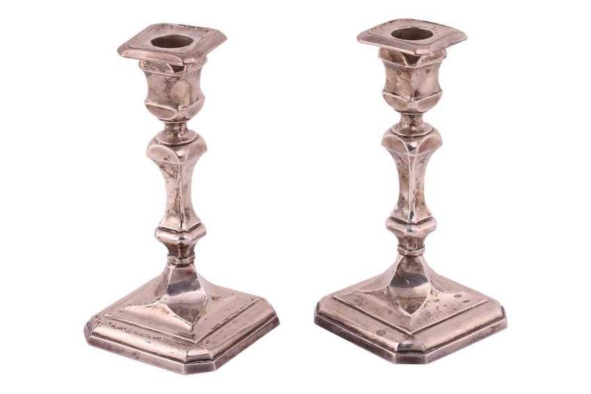 A pair of early 20th-century table candlesticks, Sheffield 1921 by Thomas Bradbury and Co, the squat square section with double knop stems and ogee moulded bases (loaded) 17.5 cm overall height