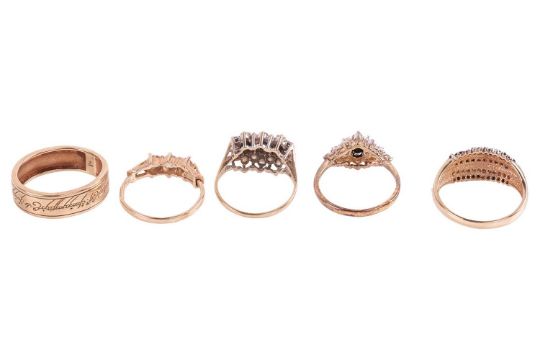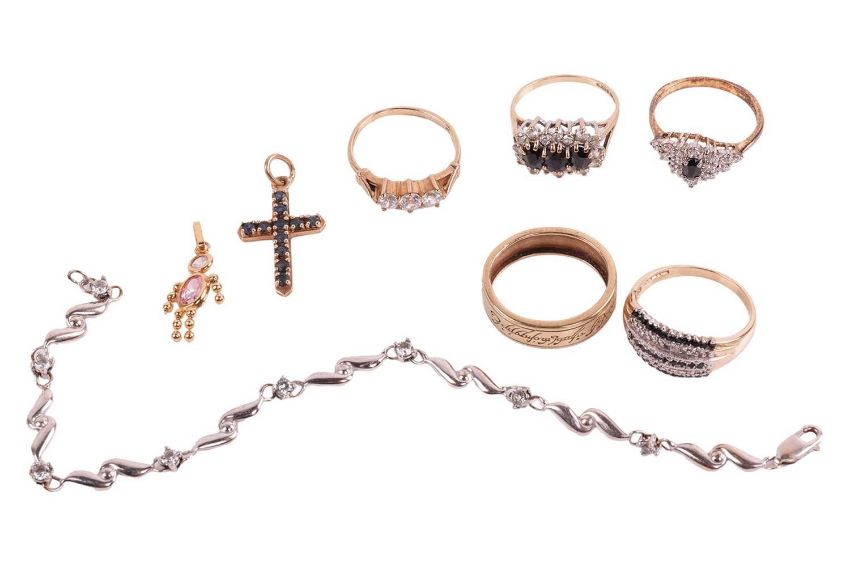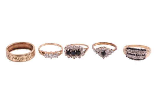 A small group of jewellery; including a sapphire, diamond and possible replacements ring in 9ct gold, size S ½; A three stone sapphire and cubic zirconia cluster ring in 9ct gold, size O; A sapphire and cubic zirconia cluster ring in gilt metal, size P ½; A 9ct gold and cubic zirconia ring, size P ½, A 9ct gold band with Lord of the Rings style inscription, size Q; A sapphire crucifix, set in yellow metal stamped 375; A cubic zirconia figural pendant, set in yellow metal, bale stamped 375; A white metal and cubic zirconia bracelet, marked 9ct with a later added base metal clasp; Total weighable 17.8g (8)