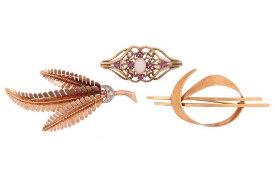 A diamond-set fern brooch, an opal and amethyst brooch and a 9ct gold brooch; A diamond-set fern brooch, estimated total diamond carat weight 0.03ct, set in yellow metal testing as 18ct, with a locking safety catch; The opal and amethyst brooch of foliate motif design, set in yellow metal testing as 10ct, with a locking safety catch; The 9ct gold brooch of abstract design, UK Hallmarks, London import mark, 1967; Total weight 13.3g (3).