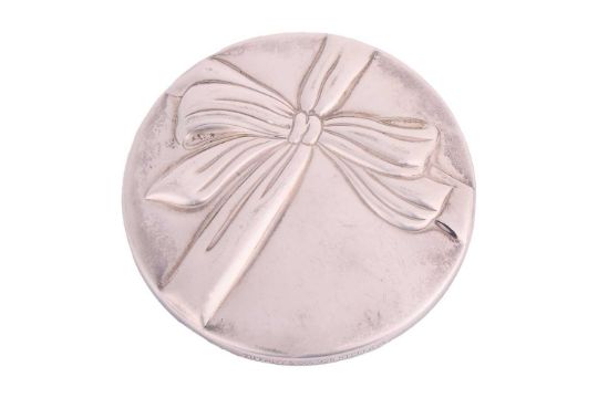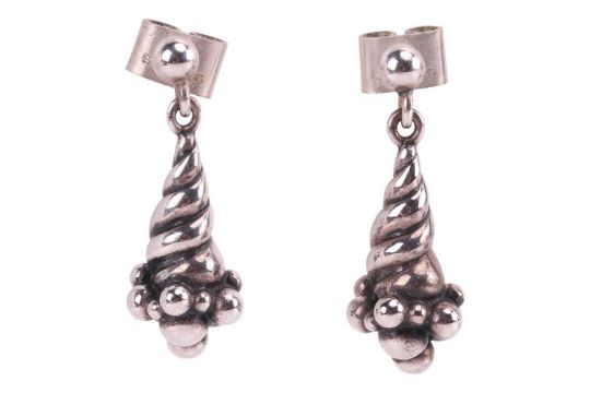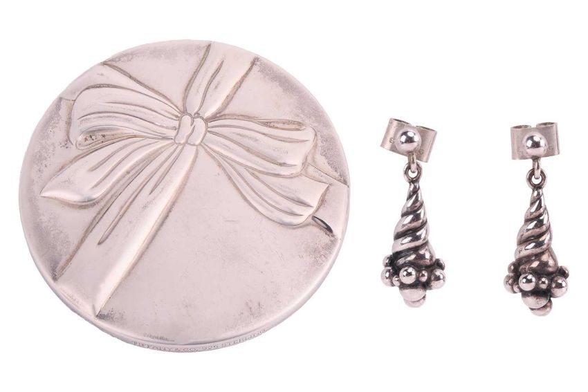 A pair of Georg Jensen earrings and a Tiffany & Co compact mirror; A pair of Georg Jensen white metal drop earrings, designed by Ole Kortzau, number 363 of drop grape design, length approximately 3cm, the reverse stamped ‘925 S’ and marked with Georg Jensen makers mark, boxed; A Tiffany & Co pocket mirror, embossed with bow design, marked with London import mark to the side and dated 19995, stamped ‘Tiffany & Co. 925 Sterling’, with pouch; Total weight 71.7g (2)