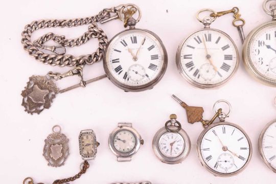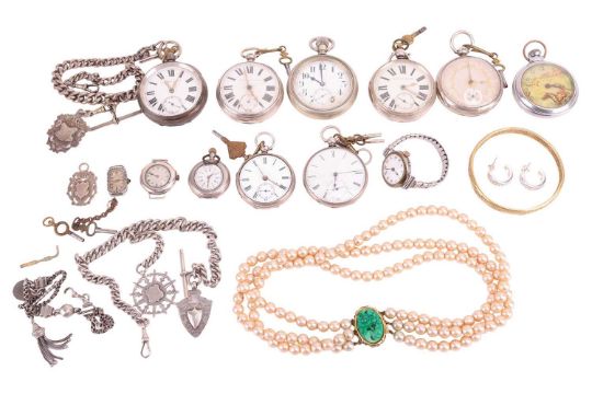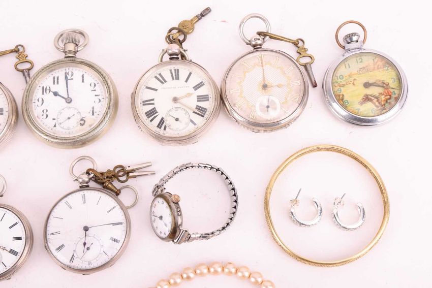 A group of items consisting of nine open-face pocket watches, two watch faces, two watch chains and one charm, a wristwatch and three spare watch keys. This lot also includes a yellow metal bangle testing as 18ct, an imitation pearl necklace and a pair of paste ear hoops; Total weight