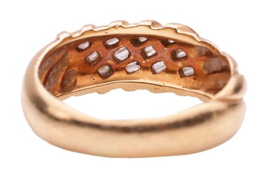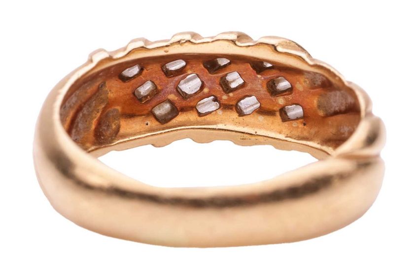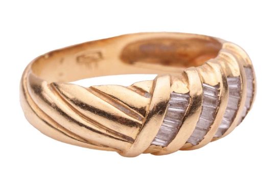 A diamond-set dress ring of twisted rope design, embellished with four diagonal rows of channel-set baguette diamonds, to a tapered shank in yellow metal stamped '750', size O½, 5.2 grams.