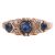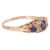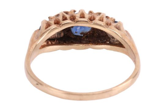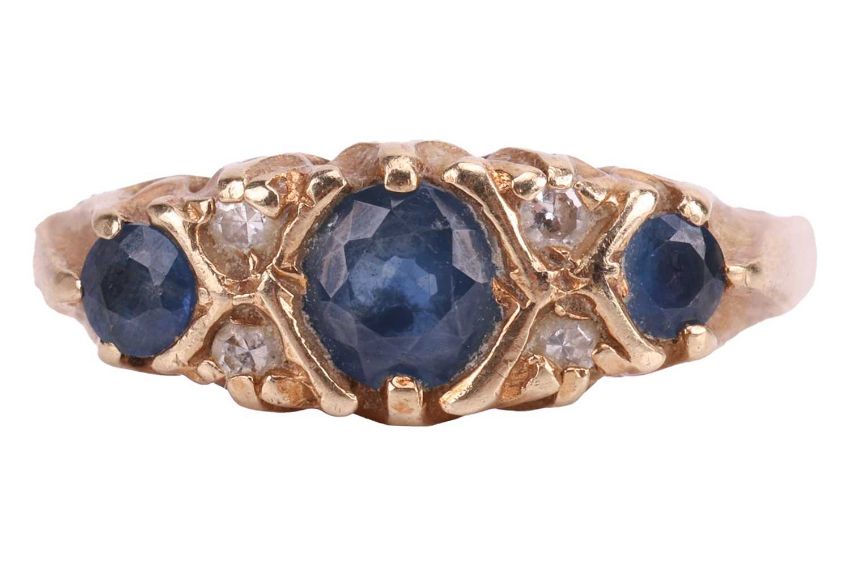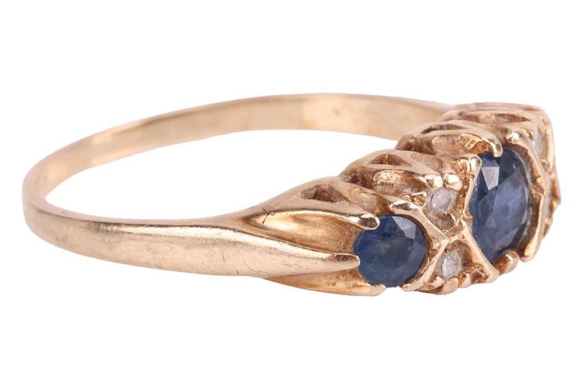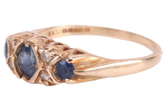 A sapphire and diamond 9ct gold ring, one central claw-set sapphire flanked by two smaller sapphires, interspersed with two diamonds, estimated total diamond carat weight 0.02ct, set in 9ct gold, hallmarks for London, 1994, makers mark ‘G & TJ’, size P, weight 2.9g