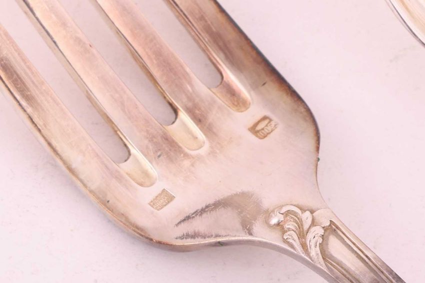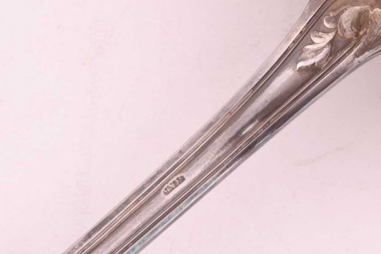 A French Metal Alliage Blanc part canteen with acanthus scrollwork finials, comprising twelve tablespoons, twelve table forks, twelve teaspoons and a soup ladle, cased.