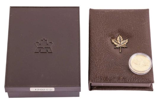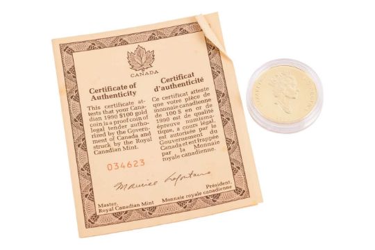 Royal Canadian Mint, 1990 $100 1/4ozt fine gold coin, limited edition numbered 34623, in original presentation box and with paperwork.