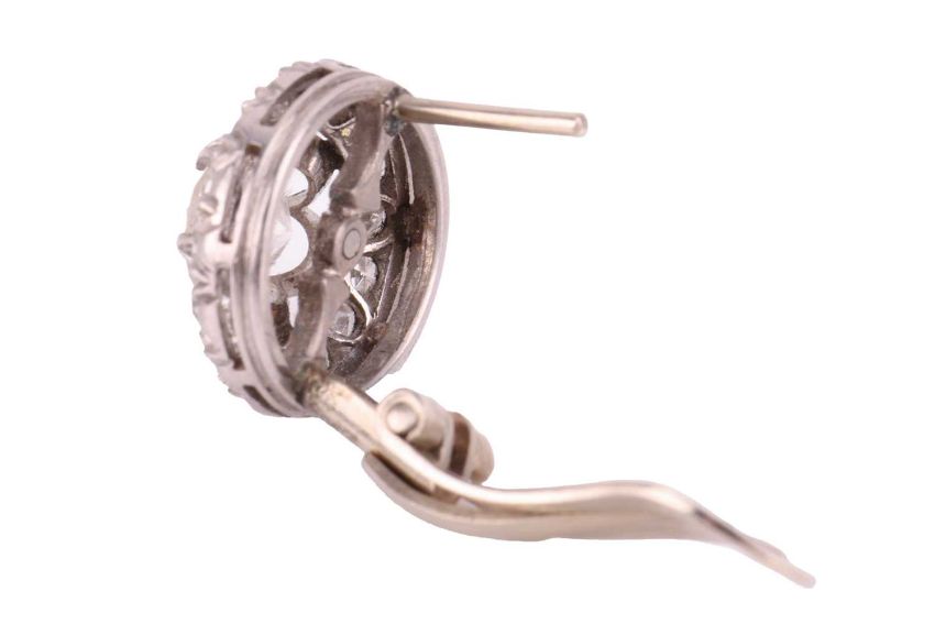 A diamond cluster single earring, centred with an old european cut diamond of 5.2 mm, with an estimated weight of 0.54ct, in a buttercup setting encompassed with a frame of single-cut diamonds, fitted with a post and omega clip, unmarked white metal testing as 18ct, 1.1 cm wide, 2.25 grams.