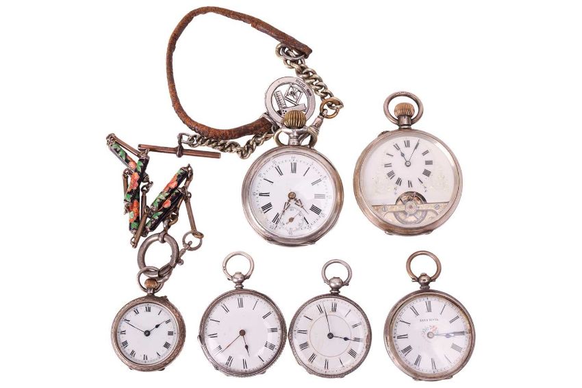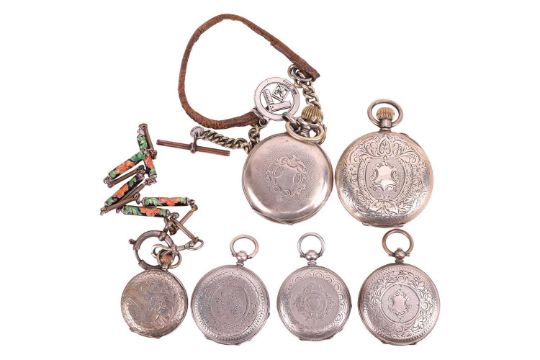 A collection of six silver half hunter and open face pocket watches comprising a Sans Rival silver pocketwatch on Masonic fob, together with five further silver pocketwatches, gross weight 351.2g