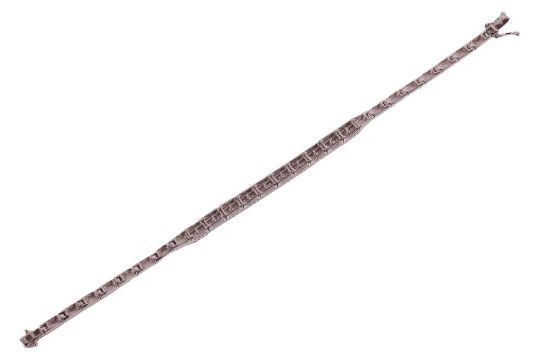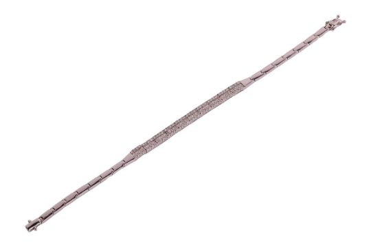 A diamond-set link bracelet, comprising a series of articulated bar links, with the central segment encrusted with a row of baguette-cut diamonds and bordered with brilliant-cut diamonds, completed with a conforming box clasp with double safety catches, in white metal marked '375', overall length 16.7 cm, 7.1 grams.
