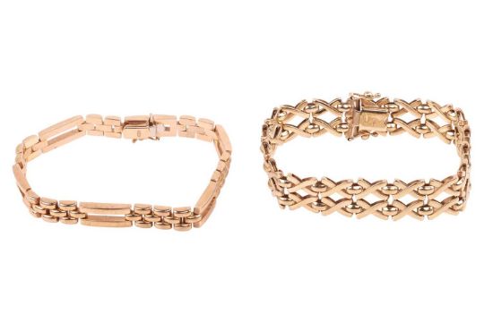 Two 9ct gold bracelets; The first a 9ct gold bracelet featuring two tiers of oval and stylised cross-lashing links, approximately 18.75cm long, UK Hallmarks, Sheffield import mark, 1992; The second a 9ct gold gate link bracelet, approximately 18.5cm long, UK Hallmarks, London import mark, 1993; Total weight 32.5g (2).