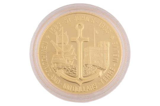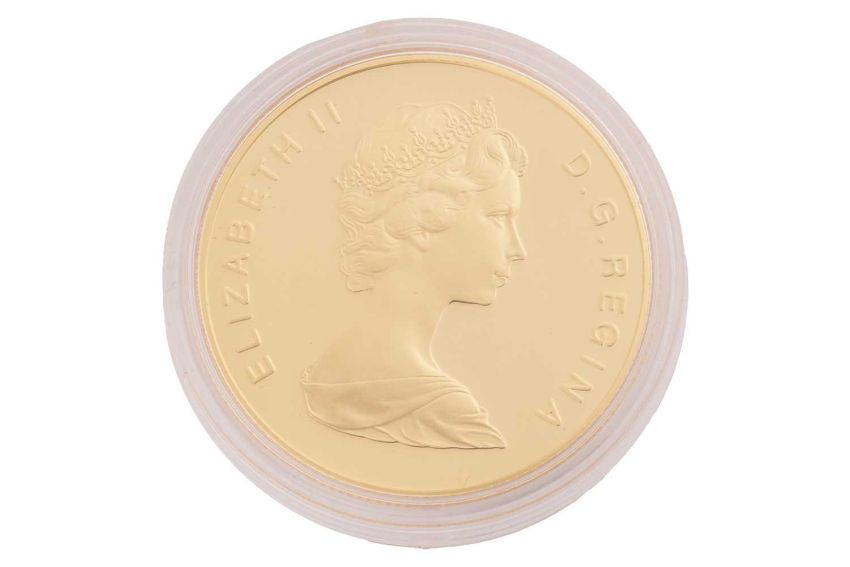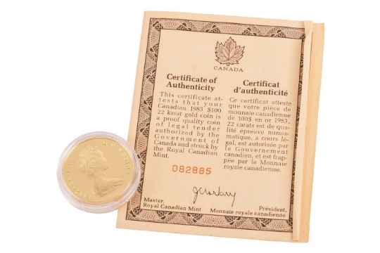 Royal Canadian Mint, 1983 $100 gold proof coin, 16.9g, limited edition numbered 82885, in original presentation box and with paperwork.