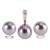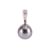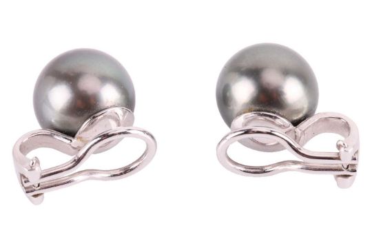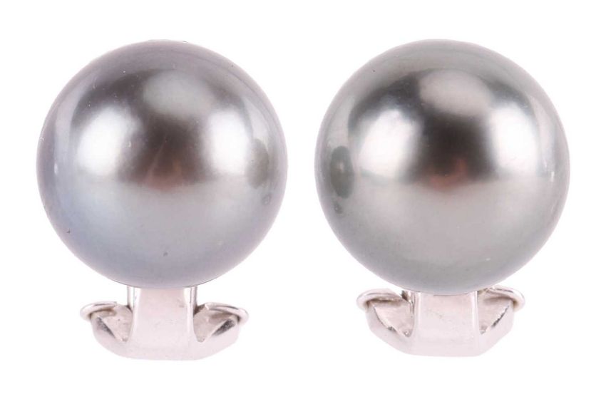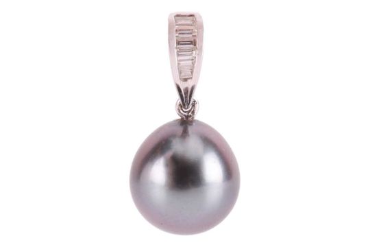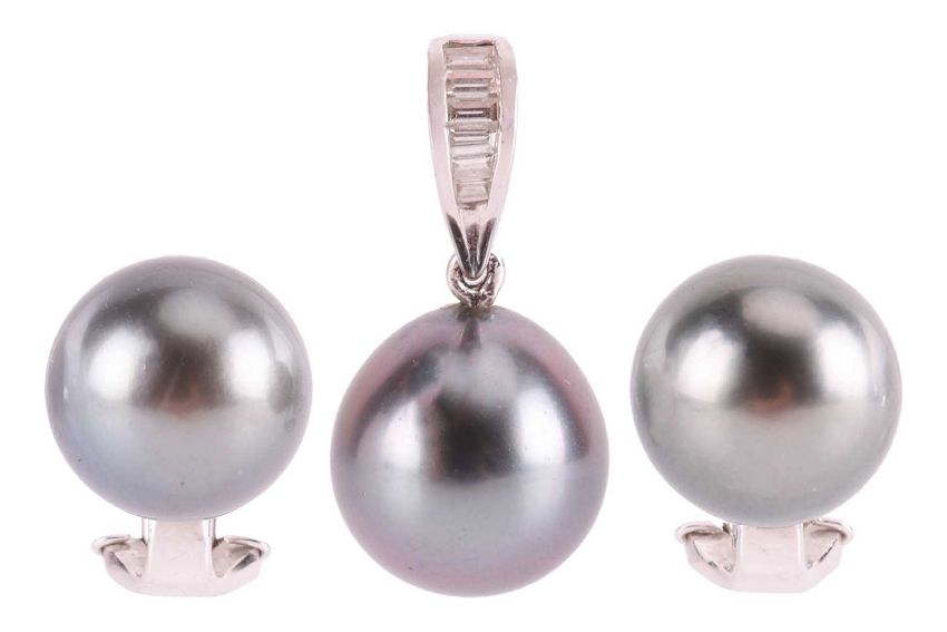 A Tahitian cultured pearl pendant and earrings ensuite, the pendant comprising a drop of 10.5 mm, suspending on a bail in 18ct white gold, channel-set with a row of calibré-cut diamonds, British hallmarked, 2.0 cm drop; together with a matching pair of clip-on earrings, each mounted with an 11.0 mm round cultured pearl to omega clips, white metal testing as 18ct; Total weight of items 8.8 grams. (2)