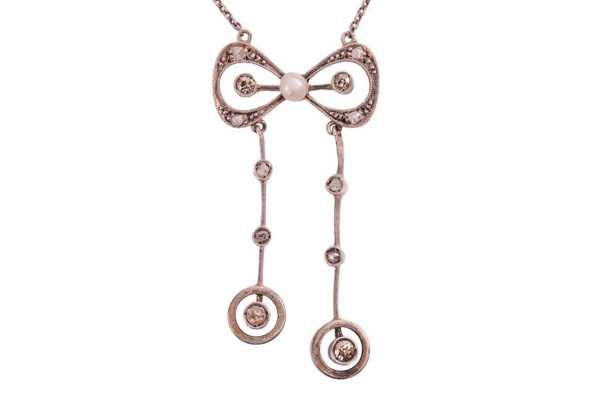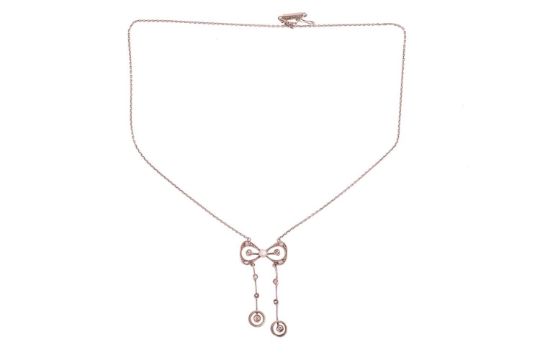 An Edwardian diamond and pearl négligée necklace, of bow design, set with single-cut diamonds and a button pearl highlight, suspending asymmetrical knife-edged bar drops, attached to a fine cable link chain with box clasp, pendant testing as silver on 14ct, drop length 4.3 cm; chain testing as silver, overall length 39.0 cm, total weight of item 4.2 grams.