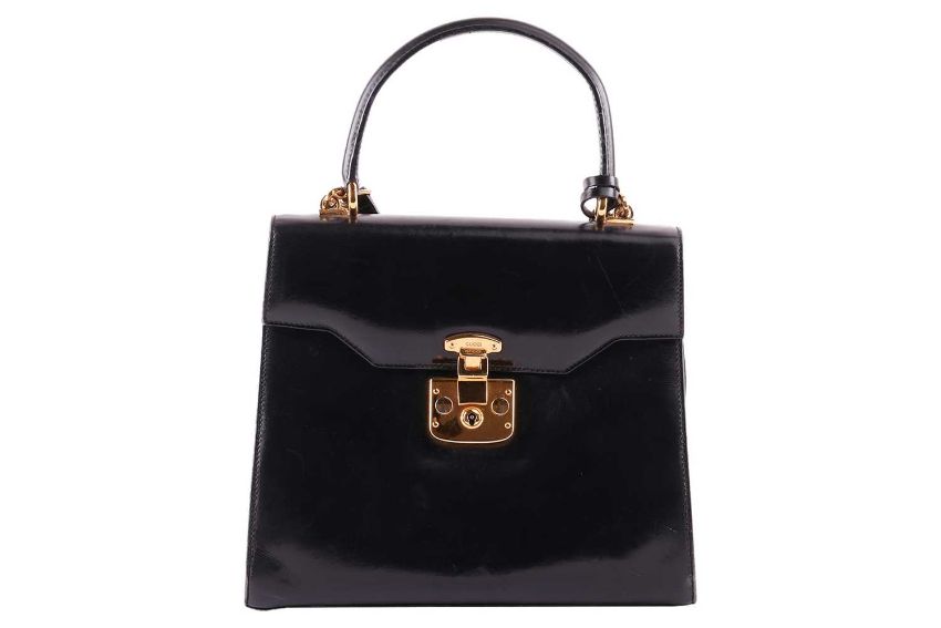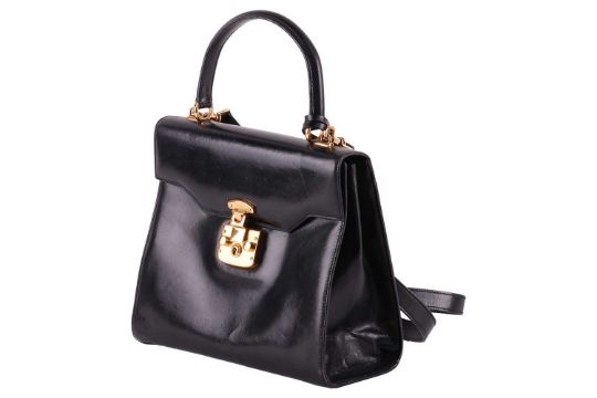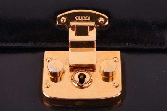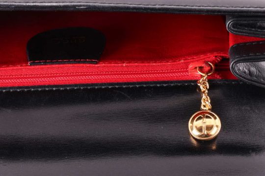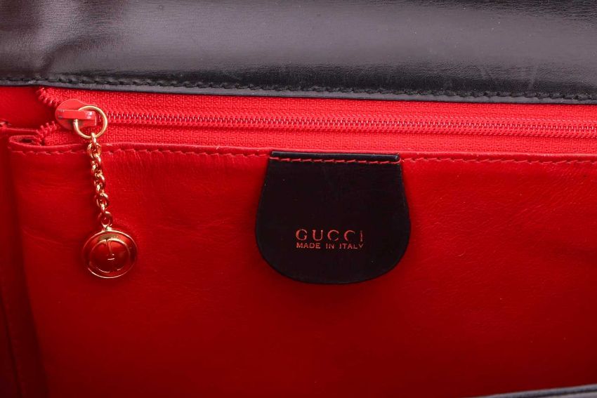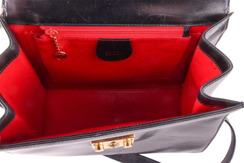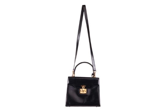 A Gucci black leather handbag, of plain tapering rectangular form and red leather interior, with a top handle as well as a detachable shoulder trap, in dust bag.