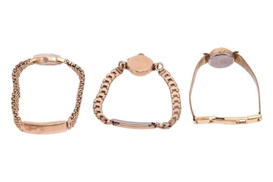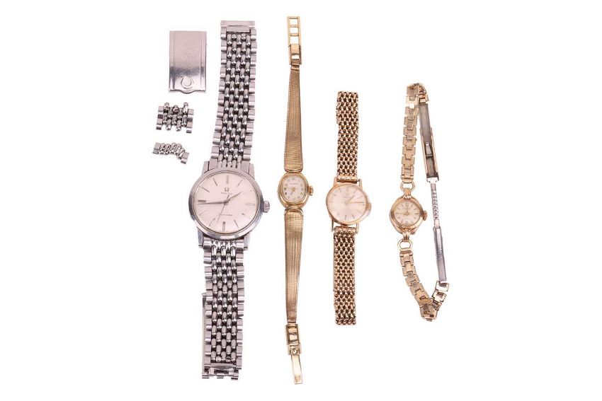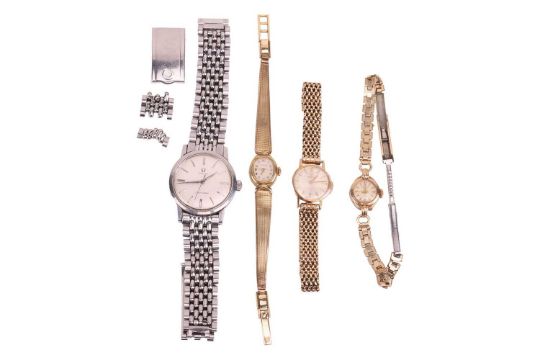 Four watches; comprising an Omega Seamaster wristwatch, with a stainless steel bracelet strap, in a branded box, together with a 9ct gold Omega ladies wristwatch and two additional gilt watches; 344.5 grams (4)