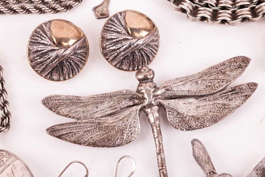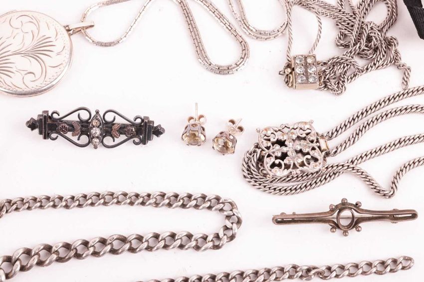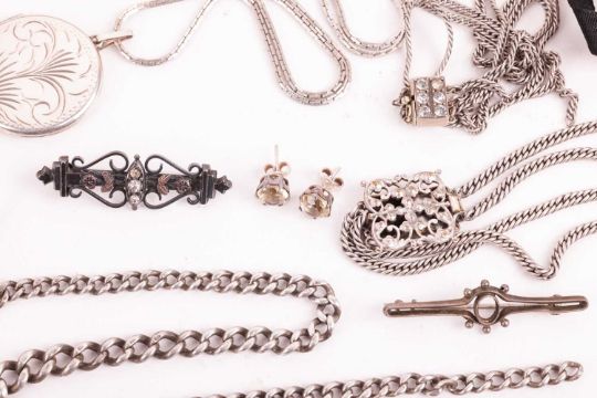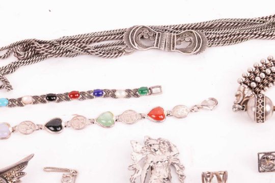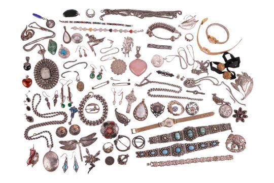 A group of silver, white metal and other base metal jewellery, including examples of two engraved silver lockets, a silver Celtic cross pendant, a Scottish hardstone brooch, filigree bracelets and pendant, a gold-plated ladies watch, various white metal gem-set brooches, earrings and others.