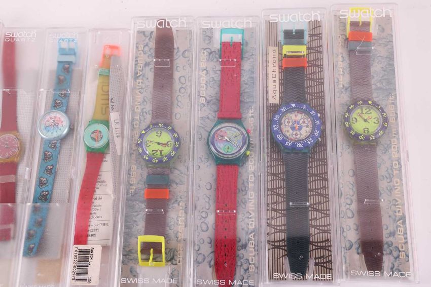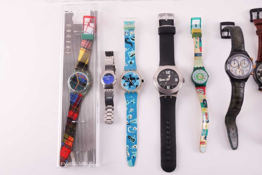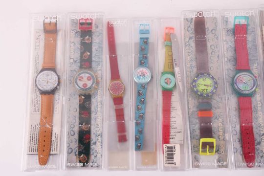 A collection of vintage Swatch comprising 15 models most with cases of varying age and theme, together with two further fashion watches.