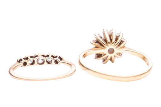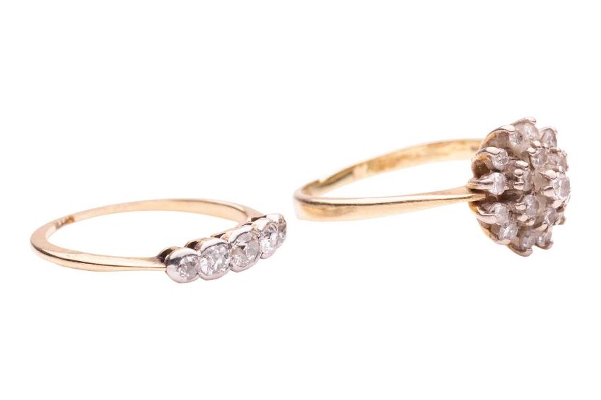 Two diamond set rings; One diamond cluster set ring in 18ct gold, estimated total diamond carat weight 0.28ct, dated 1983, size P ½; Five-stone diamond ring in yellow metal testing as 18ct, estimated total diamond carat weight 0.29ct, size L ½; Total weight 5g (2).