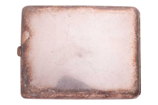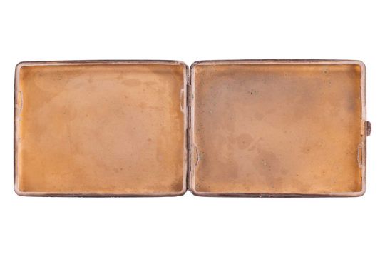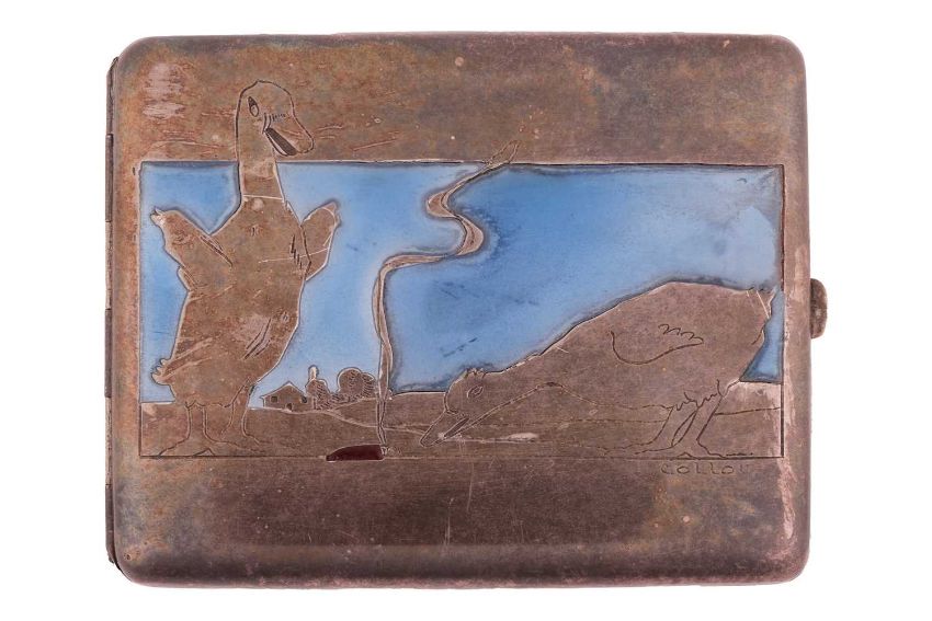 A French Art Deco cigarette case, of rectangular form, cover engraved with an illustration of two cartoon ducks, and decorated with enamel, signed 'L. Collot', side push-in thumbpiece open to reveal a gilt interior. Stamped 'Unis France' for National Inter-Union of Collective Brands. 10.9 x 8.5 cm.