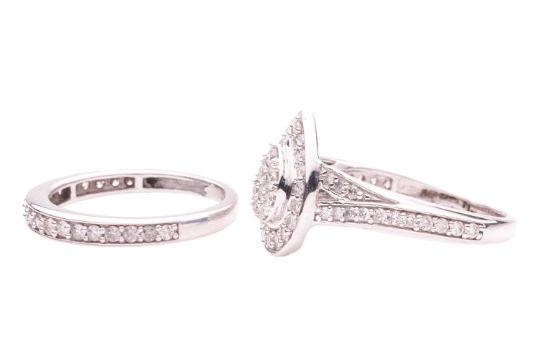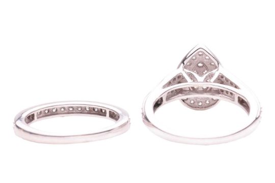 A diamond-set engagement ring and matching band, the pear-shaped cluster set with round brilliant diamonds and moissanite and leading to diamond and moissanite set bifurcated shoulders, in a 9ct white gold mount, together with a 9ct white gold diamond and moissanite set eternity band, size H1/4; 4.6 grams (2)