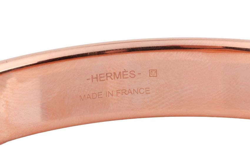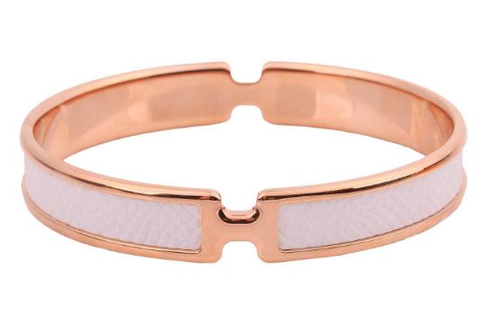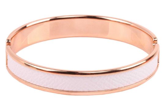 Hermès – An Olympe rose metal and leather bangle, a closed bangle comprising of white calfskin leather and a rose-coloured metal finish, signed Hermés, internal diameter 6.3, width 1.1cm; Total weight 26.2g.