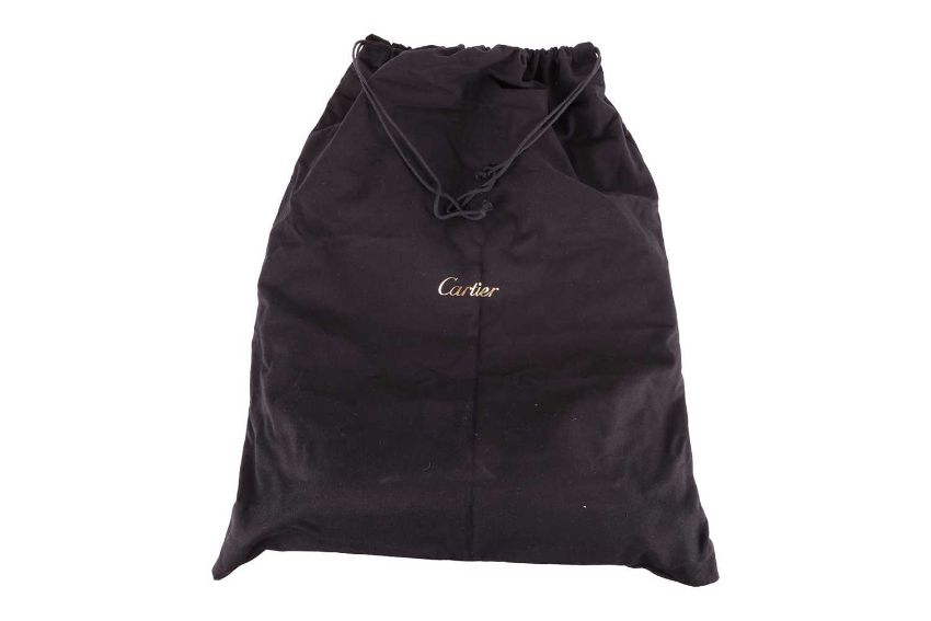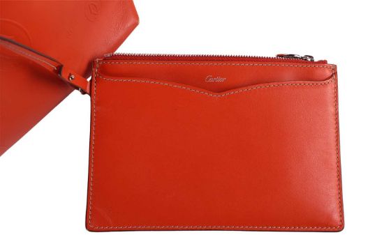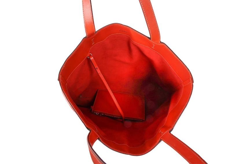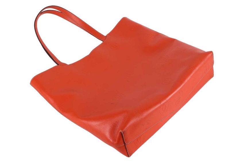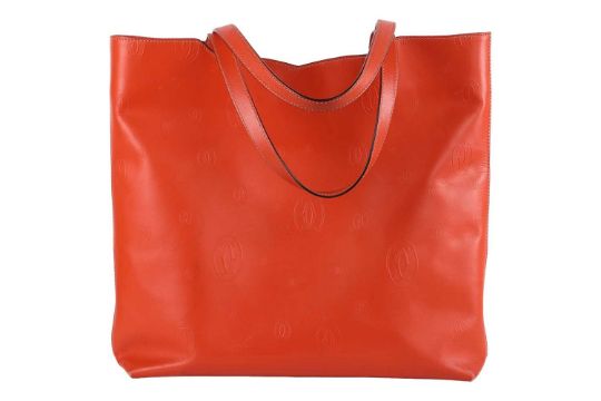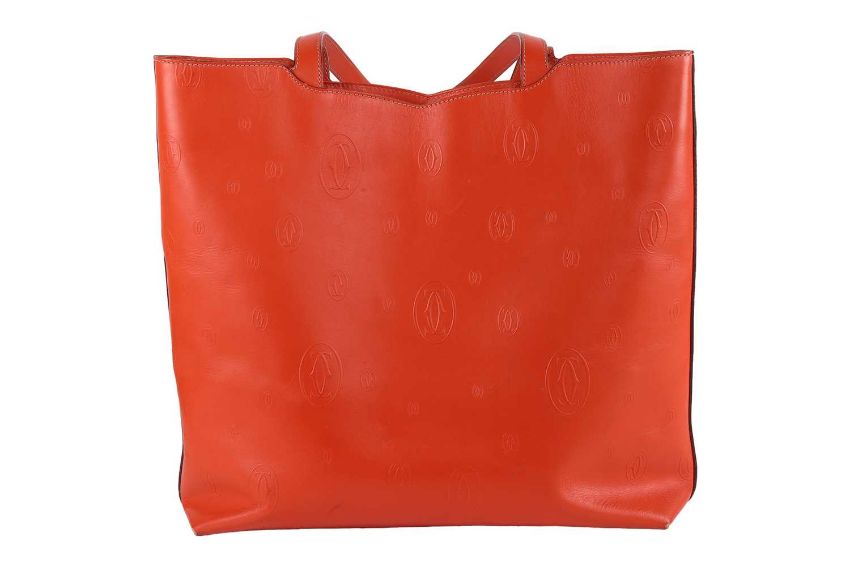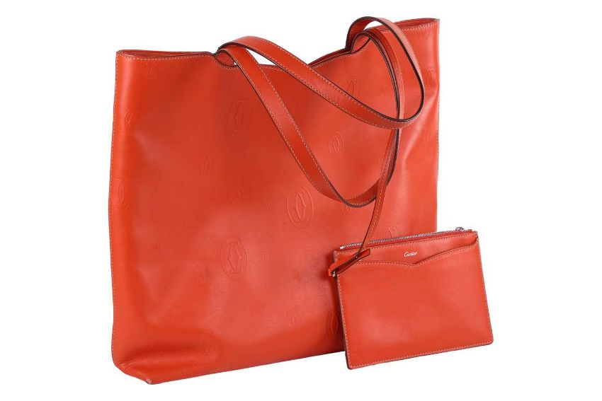 Cartier - a Happy Birthday 'Le 18H' tote bag in tangerine calfskin leather, embossed with double C logo motifs, lined with suede, equipped with shoulder straps and a detachable pouch. W34.5 x H35 x D9 cm.