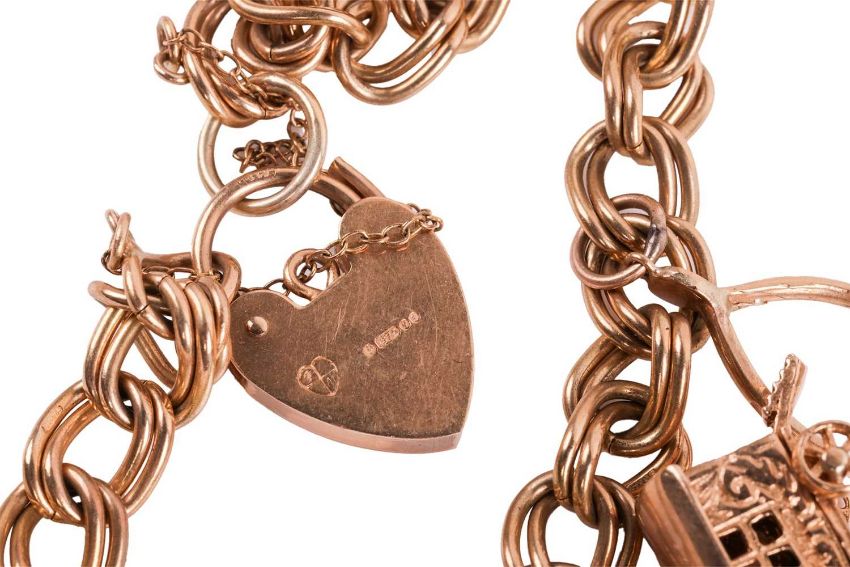 A 9ct gold charm bracelet, the double curb link bracelet leading to a heart-shaped padlock clasp, with seven assorted charms, two unattached, including a pair of scissors, a gypsy caravan with a hidden compartment, a pig, a cross, a Spanish fan and a quilted purse; 21.5 grams