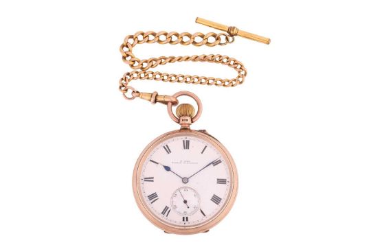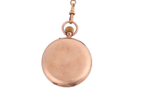 A 9ct cased W. Hird pocket watch and chain, being hallmarked to outer and inner dust covers and having white enamel dial with small second and Roman numerals, chain being hallmarked on clasp, having original fited case, gross weight 113.9g