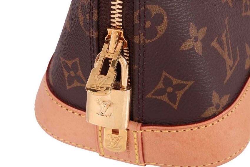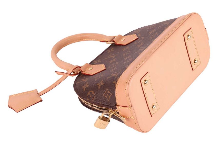 Louis Vuitton - an Alma BB bag in monogram coated canvas and tanned leather, top zipper closure with a padlock, two keys in clochette, studded leather base, two rolled top handles and a detachable shoulder strap, gold-tone hardware. W23.5 x H17.5 x D11.5 cm.