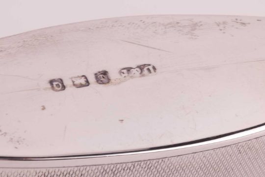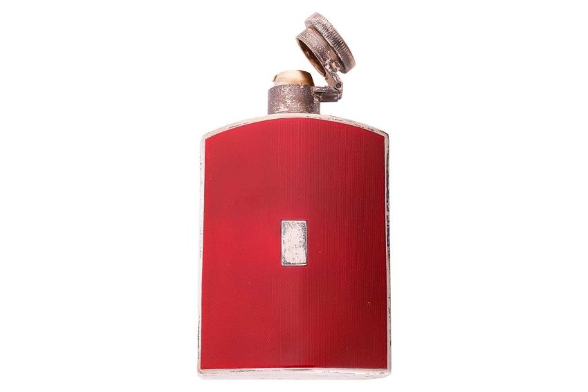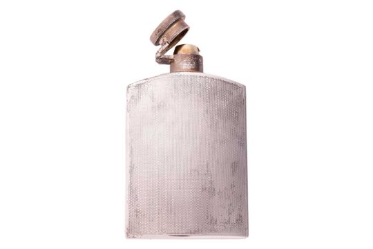 A silver and red enamel hip flask, by Deakin & Francis Ltd., Birmingham 1940, of rectangular shape with a curved top, body embellished with engine-turned pattern, the front decorated with red enamel and a vacant cartouche at the centre, 14.0 x 8.2 cm, 5.58 ozt.