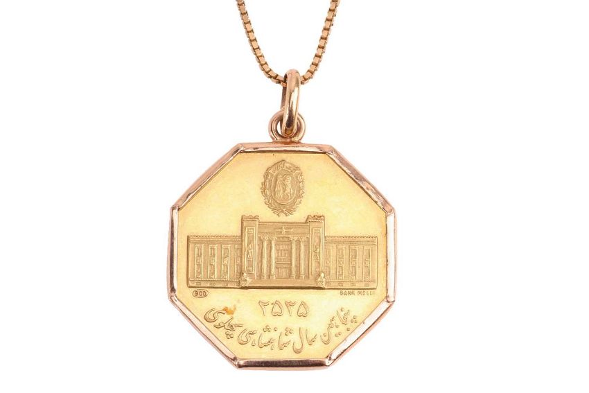 A commemorative Iranian medal, in rose-coloured metal pendant mount, with associated box link chain. The hexagonal coin was made to commemorate the 50th anniversary of the Pahlavi dynasty in 1976. The chain marked '9k' . Medal stamped '900'. Medal and mounted weigh 12.49 grams. Chain 71 cm length. 5.9 grams.