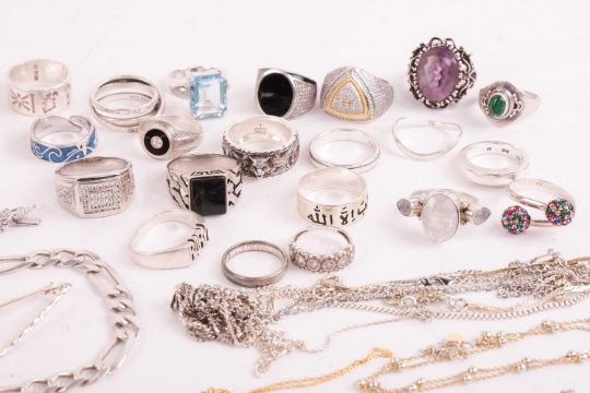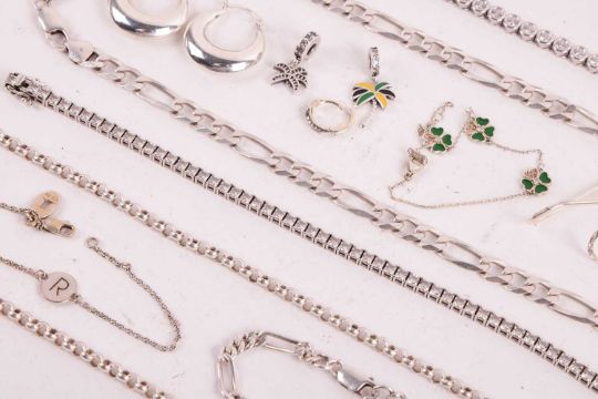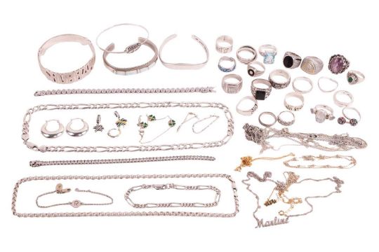 A group of silver and white metal items including a Pandora overlapping multi-row ring, three bangles, marked '925' or 'sterling', a Gucci ring, two CZ-set tennis bracelets, a belcher-link necklace, a figaro chain necklace, several gem-set rings and other items; 351.2 grams