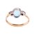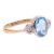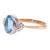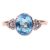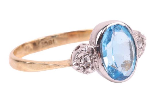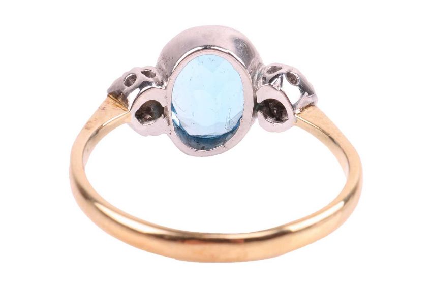 A blue topaz and diamond ring, bezel-set with a mixed oval-cut topaz, of vivid blue colour, measuring approximately 9 x 7mm, flanked by two diamonds, one rose-cut, in a white metal setting testing as platinum to a yellow metal shank testing as 18ct, size Q, 3.1g.