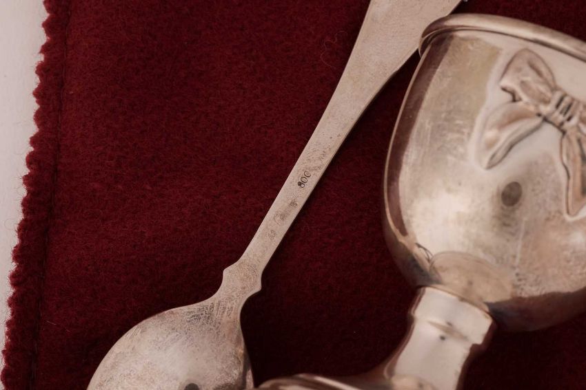 Two silver Christening egg cups and spoons in fitted cases, one with an associated hallmarked spoon, another white metal egg cup, marked 900 and spoon marked 850 another silver egg cup and spoon with a napkin ring in fitted case, and a Trabakopoulos white metal egg cup stamped 925 with spoon marked 800 in pouch and box, 4.9ozt hallmarked silver. (5)