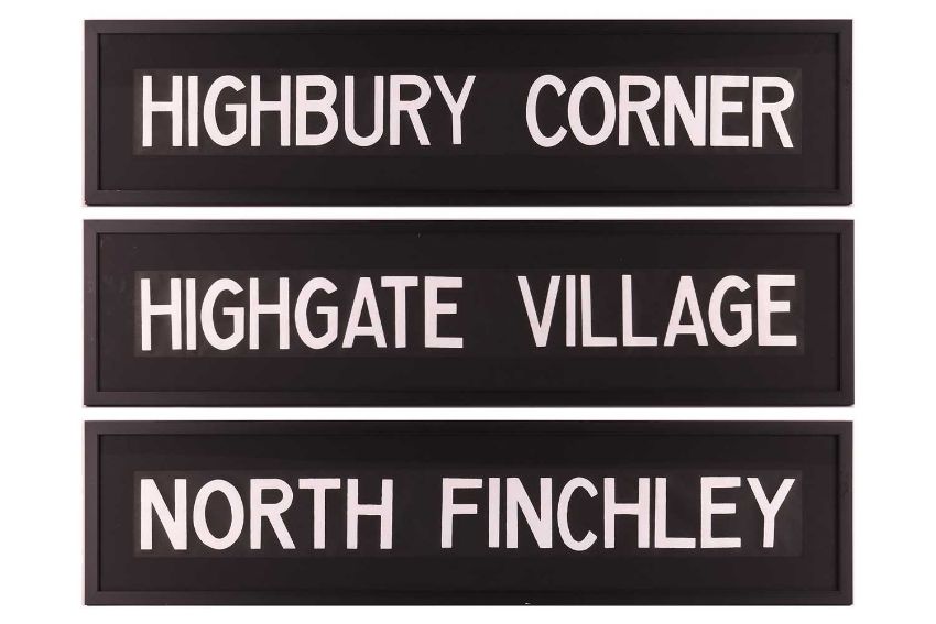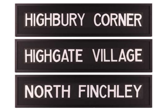 Original 1960s London Bus Blinds: Highbury Corner, North Finchley, Highgate Village, all 111 x 27 cm (3).