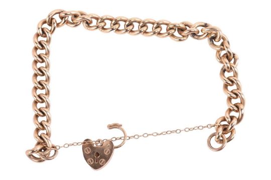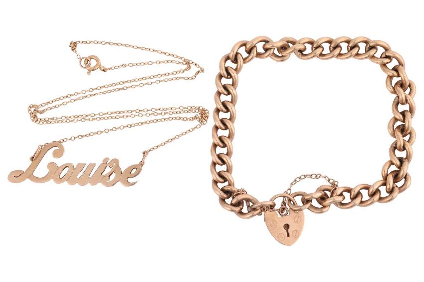 A bracelet and a necklace in 9ct yellow gold; the bracelet comprising a solid curb link chain with a heart-shaped padlock clasp, both British hallmarked, overall length 18.0 cm; a 'Louise' necklace on a fine cable link chain, British assay marks for 9ct gold, overall length 42.0 cm; Total weight of items 25.0 grams. (2)