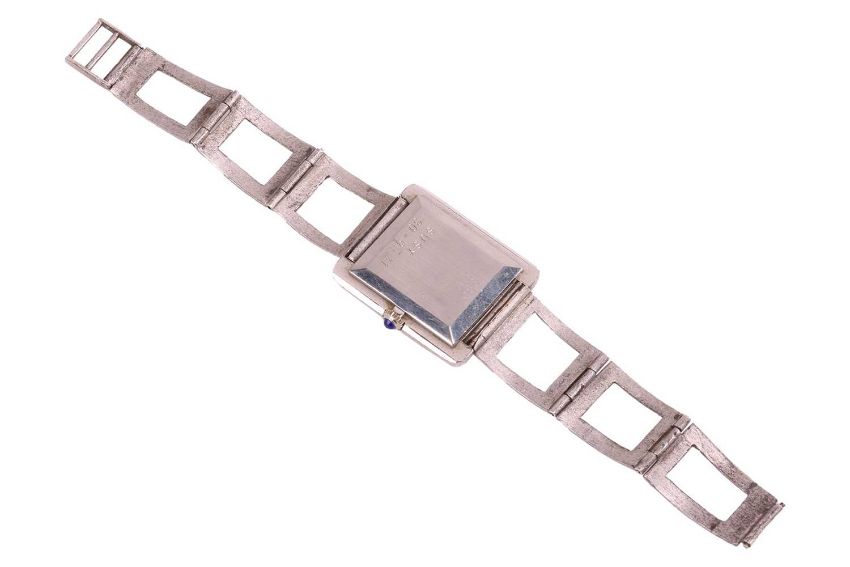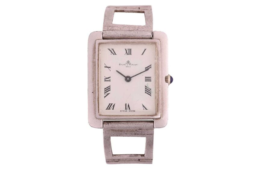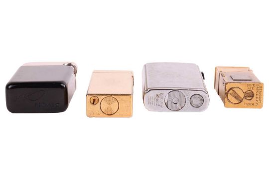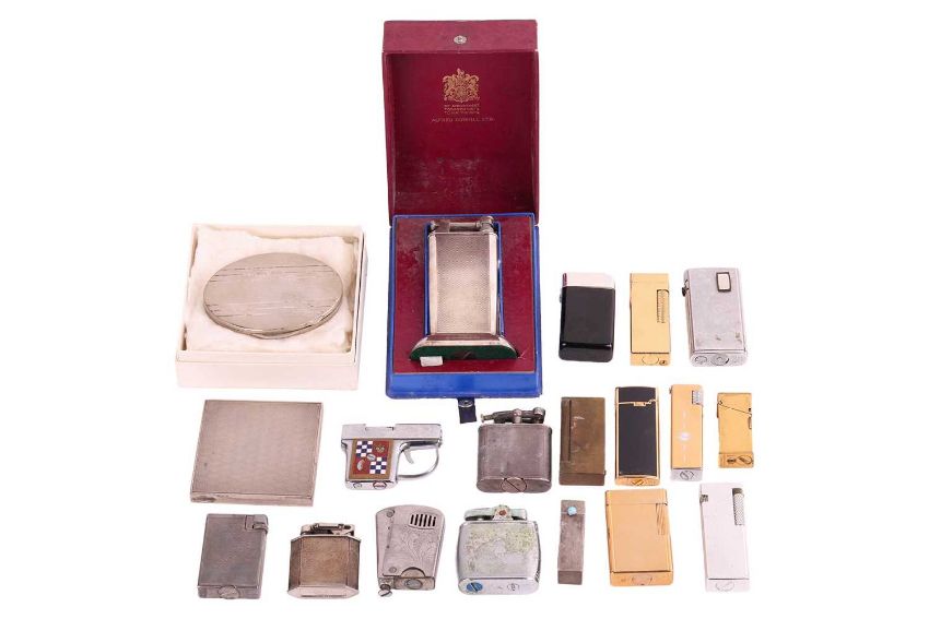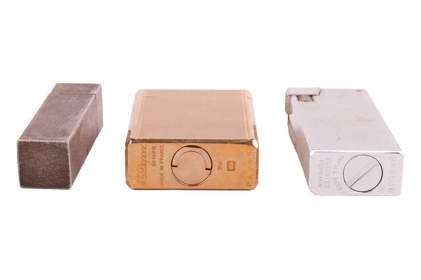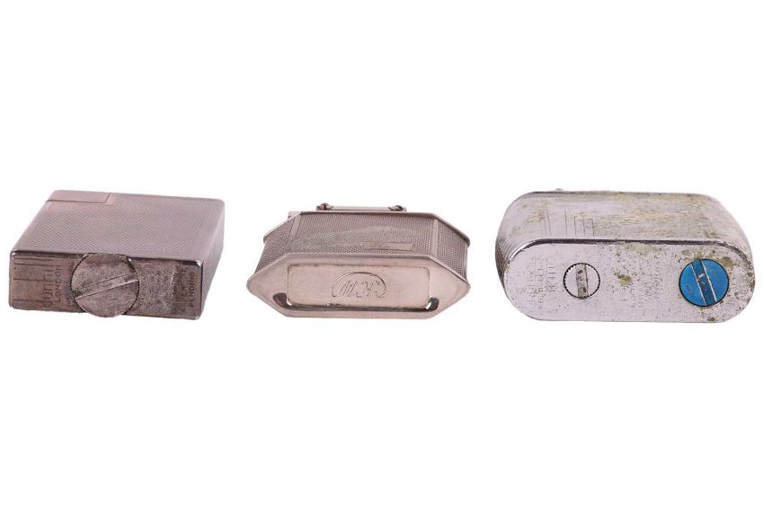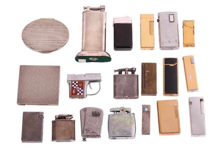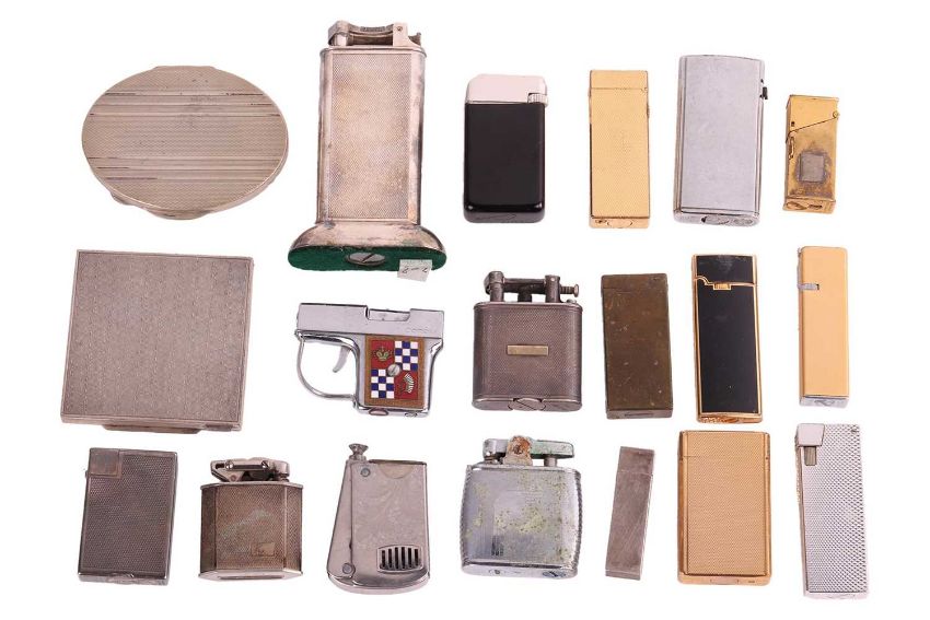 A collection of lighters and a Baume & Mercier watch; The selection of sixteen lighters including a large cased lighter by Dunhill Ltd together with two powder compact cases, a lipstick holder and a Baume & Mercier silver-plated watch, serial number 25793, case measuring 26mm x 28mm, white dial with roman numerals, automatic movement, openwork tapered link strap with a fold-over buckle, no box no papers.
