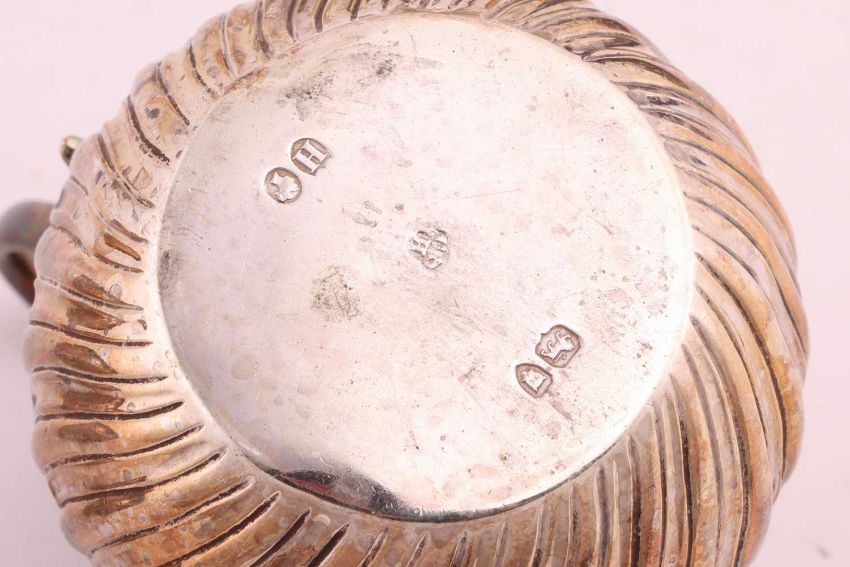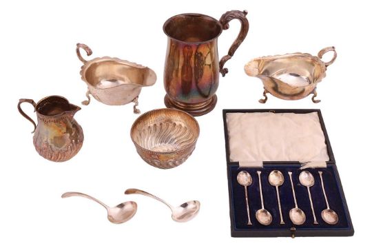 A collection of silverware comprising, a silver tankard engraved with a monogram, a Victorian silver milk jug, a silver sugar bowl, a pair of silver sauceboats with flying scroll handles, a pair of silver sauce ladles and a set of six silver coffee spoons with seal tops in fitted case, approximately 822.8 grams (26.4ozt).