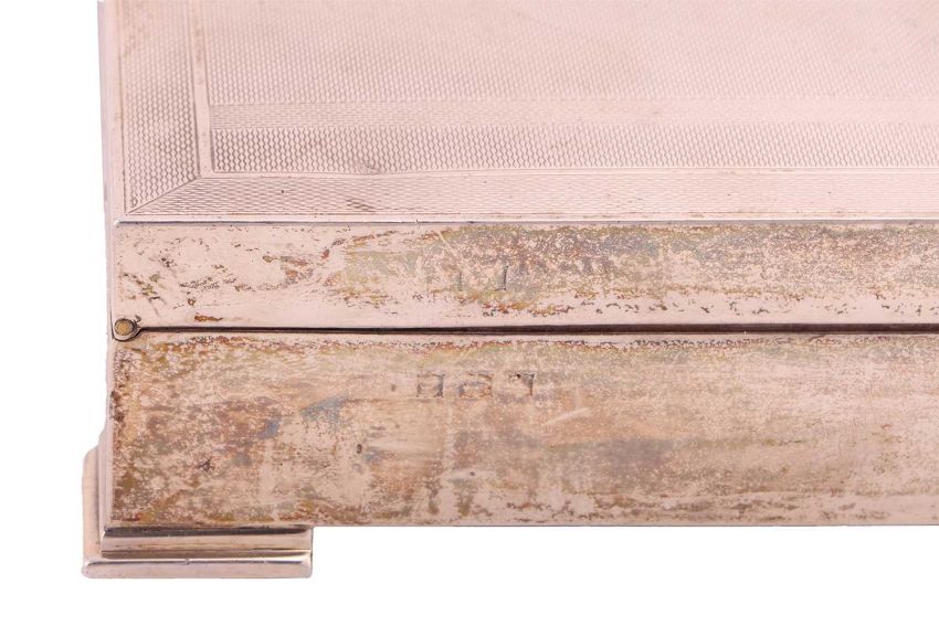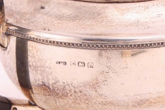 A silver cigar case with engine turned decoration on four bracket feet, a silver teapot with an ebonised handle and a silver mustard pot with a hinged cover and matching salt with a blue glass liner, approximate weight excluding the cigar case, 370 grams, (11.9ozt) (4).