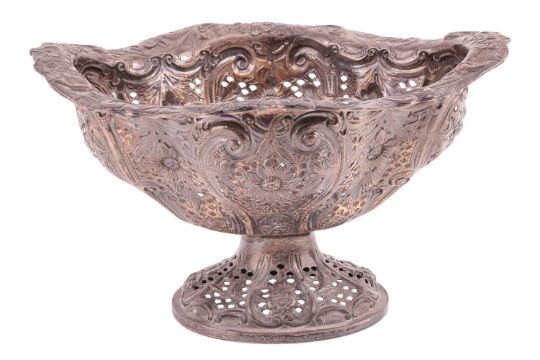A Victorian pierced silver basket, by Charles Stuart Harris, London 1888, the pierced body with scrollwork and embossed floral decoration, on a conforming spread pedestal, 26.0 cm wide, gross weight approximately 441.96 grams (15.59 ozt).