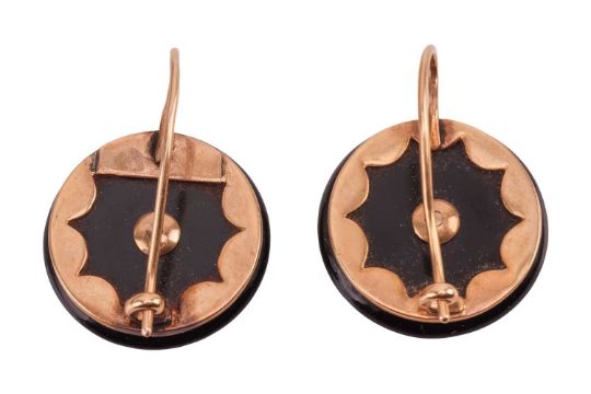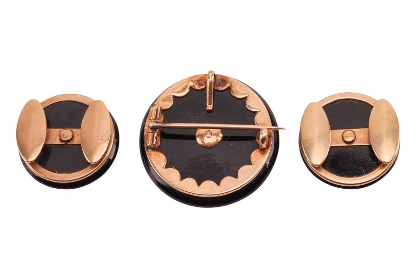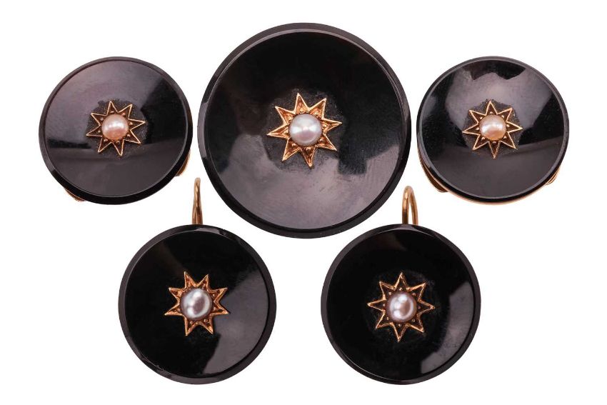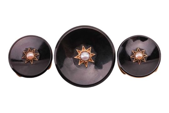 A Victorian onyx and pearl brooch, hook earrings and dress stud set; each composed of a concaved circular onyx plaque, centrally applied with a split pearl in star mount, fittings to verso, unmarked yellow metal testing as 15ct, brooch measuring 2.8 cm wide, dress studs and earrings measuring 2.0 cm wide; Total weight of items approximately 23.7 grams (3).