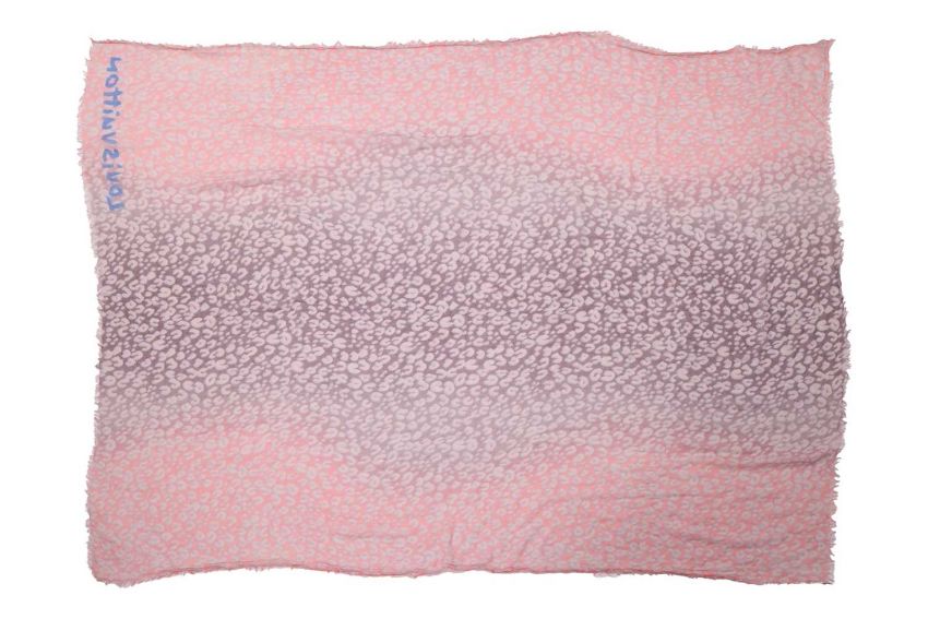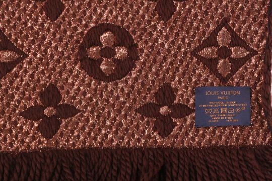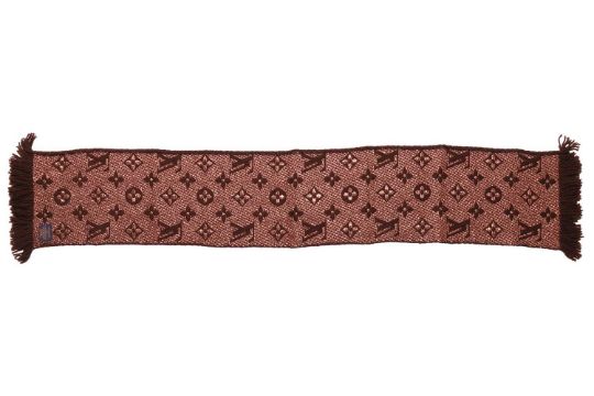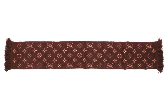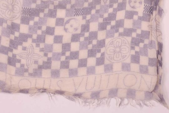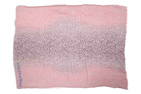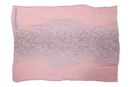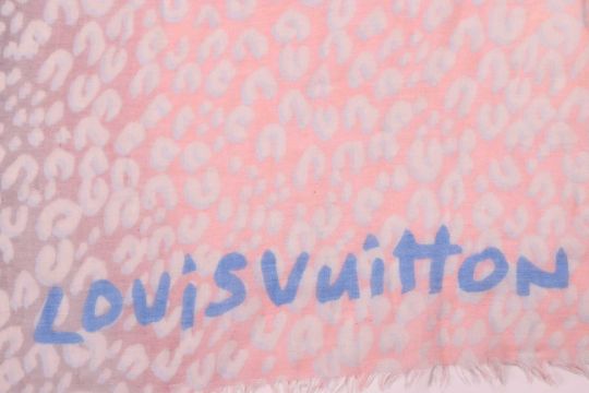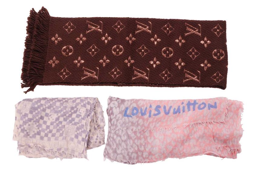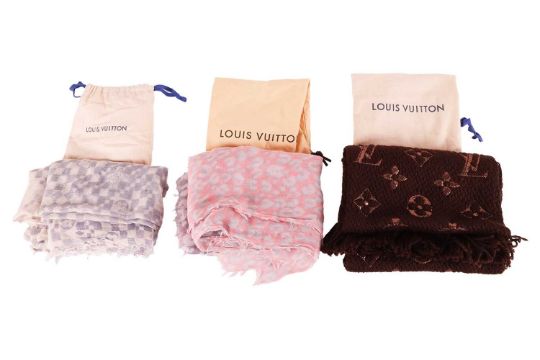 Louis Vuitton – Three scarves; One Etole Leopard Blurry Stole fading from pink to blueish grey, with blue monogram printed to one edge, approximately 140cm x 190cm, with papers and dustbag; One Damier Azur Etole Alize Stole in cream and blue, with Louis Vuitton tag, approximately 125cm x 180cm, with papers and dustbag; One Brown and Gold Monogram Logomania Shine woollen scarf, with Louis Vuitton tag, approximately 31cm x 176cm with papers and dustbag. (3)