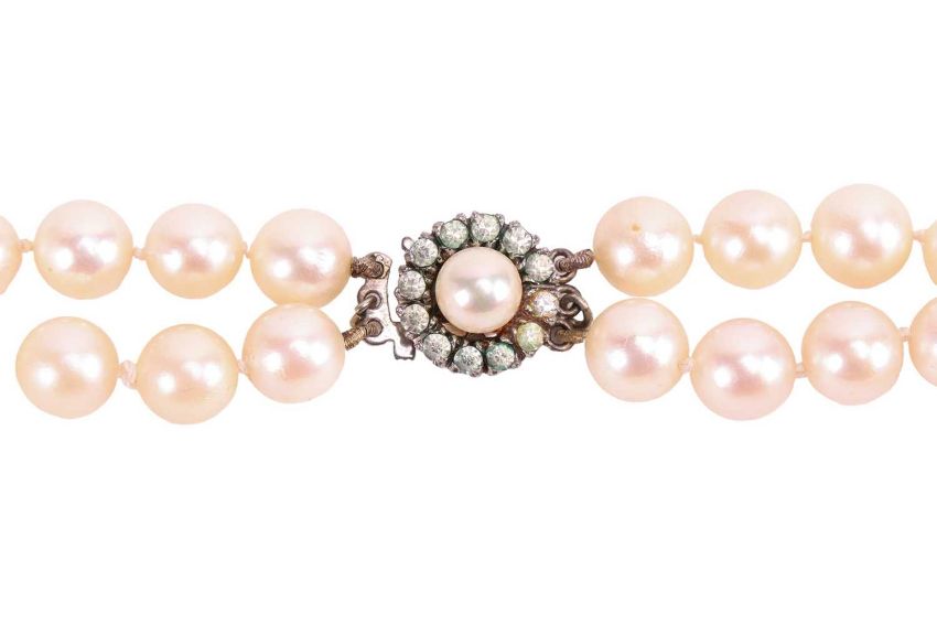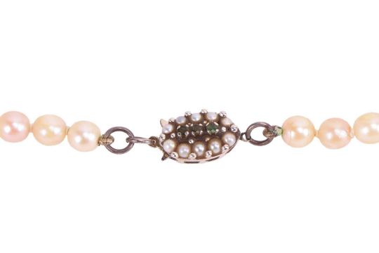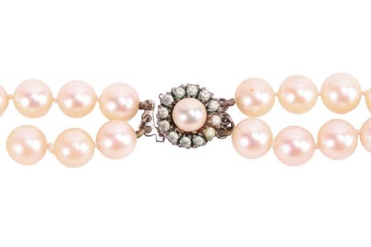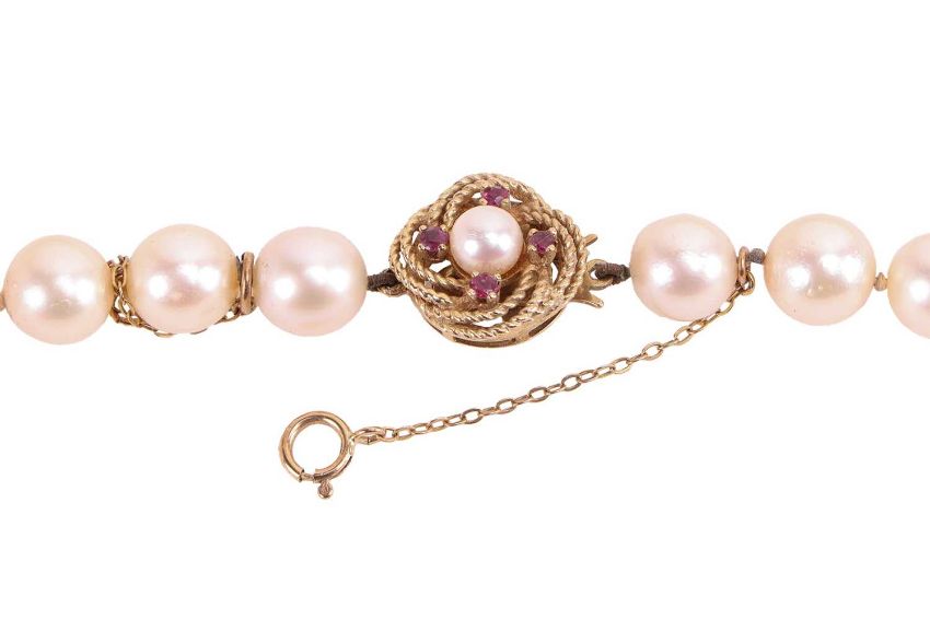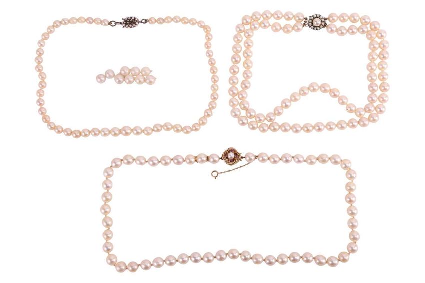 Three cultured pearl necklaces; A single strand cultured pearl necklace, pearls measuring approximately 8.1mm wide, fastened with a yellow metal fish hook clasp, of woven rope design, testing as 10ct, the clasp set with a smaller cultured pearl and four round faceted red stones, additional safety clasp, length approximately 53.5cm; A single strand cultured pearl necklace with pearl and gem set clasp, pearls graduating from 5.8mm to 8.7mm, fastened with a white metal fish hook gem-set clasp, length approximately 42.5cm; A two strand cultured pearl necklace set with a gem-set fish hook clasp, pearls approximately 8.2mm, length approximately 35cm; A small bag of nine cultured pearls; All three necklaces and loose pearls in one box; Total weight 152.1g (4).