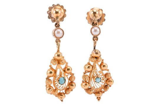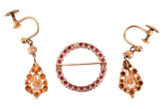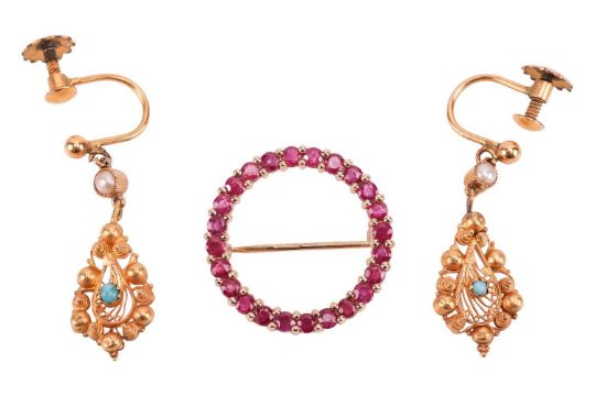 A ruby-set circle brooch and a pair of pendant earrings; the 9ct gold brooch of annular form, claw-set with an array of circular-cut rubies, brooch fittings to the back, London hallmarks, 2.2 cm wide; together with a pair of filigree drop earrings, embellished with turquoise accents, in yellow metal testing as 18ct, suspending from rolled gold screw-back fittings set with seed pearls, 3.0 cm drop; Total weight of items 4.7 grams. (2)
