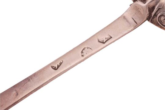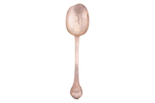A laceback silver trifid spoon, London, marks rubbed, 17th century, initialed S.B. and R.B. scroll decorated terminal and bowl, 19 cm long, approximately 36.85 grams (1.3 ozt)