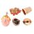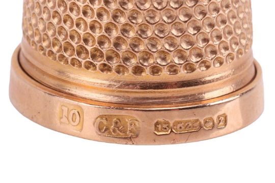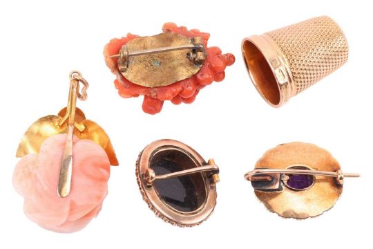 A small collection of gem-set brooches, a pendant and a 15ct gold thimble; to include an amethyst and seed pearl cluster oval brooch; another similar set with an onyx cameo; a red coral brooch carved in the form of a bunch of grapes, base metal fittings, 3.0 cm long; a pink coral pendant carved as a rose with textured foliate surmount; and a 15ct yellow gold thimble by Cropp and Farr, 4.5 grams. (5)