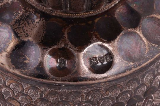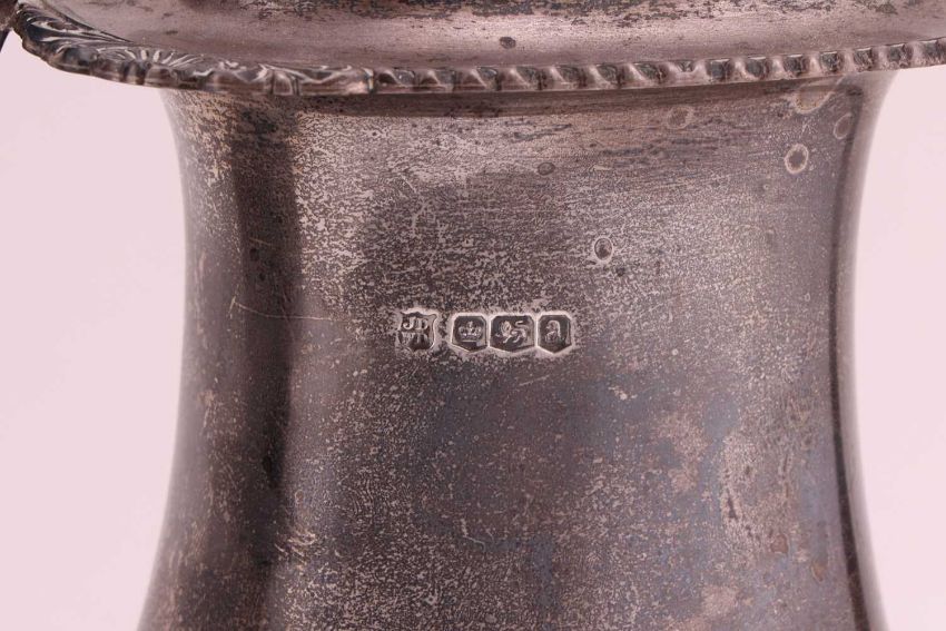 A silver coffee pot of oval form with wooden knop and handle, on four ball feet, Sheffield 1918 and an ecclesiastical silver bowl by George Nathan & Ridley Hayes, Sheffield 1905, approximately 1068 grams (34.3 ozt). (2)