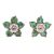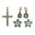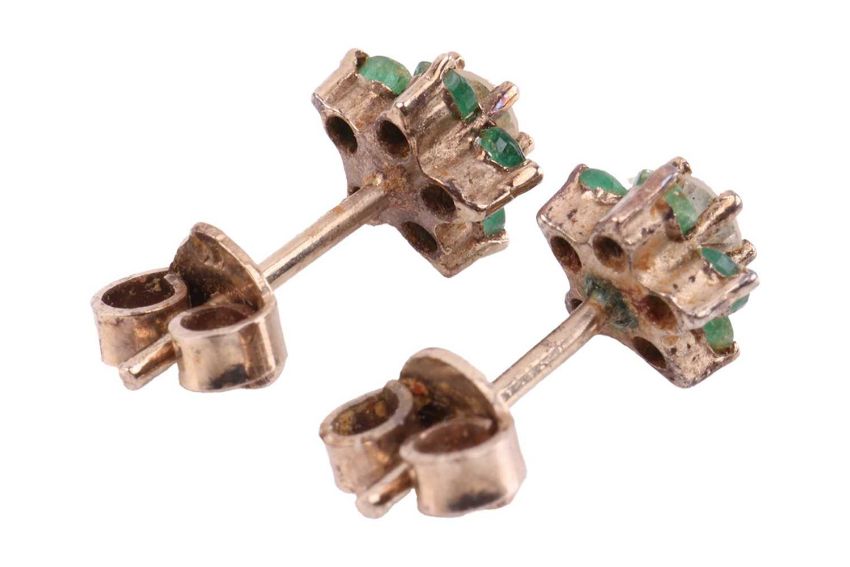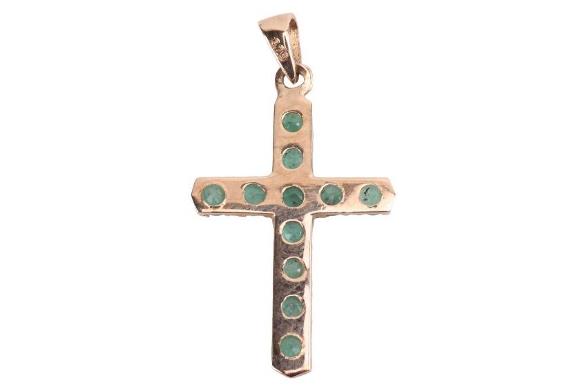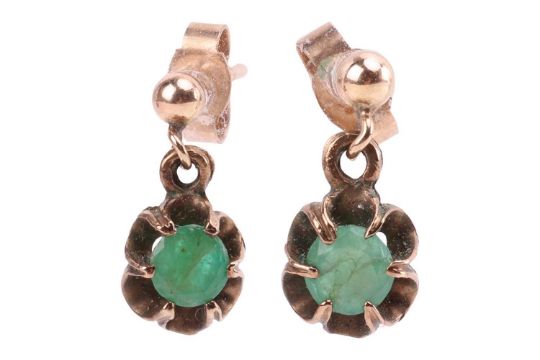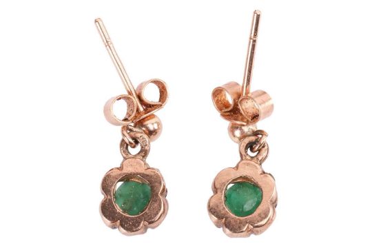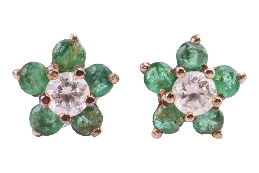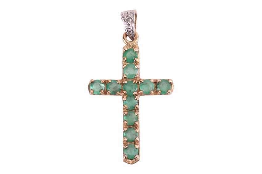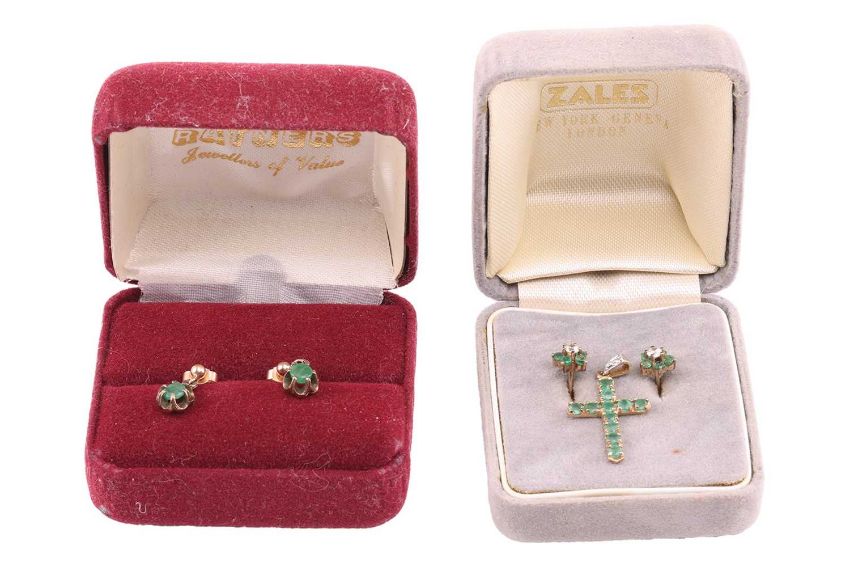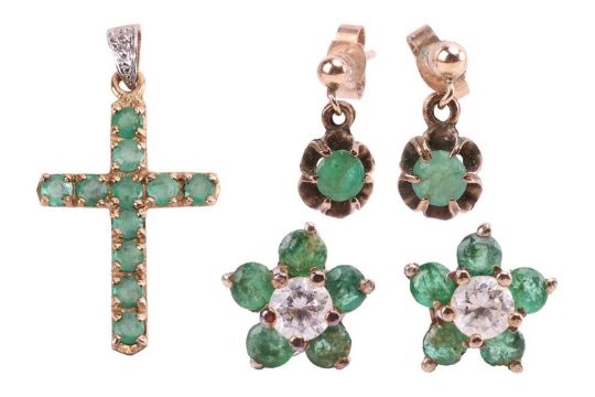 A pair of emerald drop earrings, together with a pair of emerald and cubic zirconia stud earrings and an emerald cross pendant; The emerald drop earrings, each set with a round cut emerald, in a claw setting of floral design, suspended from ball stud surmounts, earring length 1.3cm, yellow metal testing as 14ct, to posts with butterfly backings, boxed; The emerald and cubic zirconia stud earrings, of floral design, each set with a central round cut cubic zirconia, flanked by five round cut emeralds, studs approximately 0.5mm in diameter, claw set in yellow metal testing as 10ct to posts with butterfly backings; The emerald cross pendant, claw set with eleven round-cut emeralds, to a bale set with a single-cut moissanite, pendant approximately 2.3cm x 1.4cm, set in yellow metal testing as 10ct, boxed; Total weight approximately 3.2g (3).